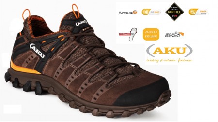 Calzatura leggera, versatile e traspirante, per utilizzo dinamico su terreni di media difficoltà. La tomaia è composta da due strutture: una esterna in scamosciato articolata da elementi indipendenti che avvolgono il piede in modo anatomico; una interna in air mesh con avvolgimento a lembi sovrapposti per assecondare l’anatomia del piede. La fodera in Gore-Tex® è di due tipologie: una elastica per la zona del collo-piede e una più protettiva per il resto della fodera. La costruzione asimmetrica della suola e tomaia con l’esclusiva tecnologia AKU Elica Natural Stride System garantisce un’ottimale distribuzione del carico sulla superficie plantare e il miglioramento del meccanismo di rullata. Il battistrada AKU con speciale mescola Tenuta garantisce un’eccellente aderenza.