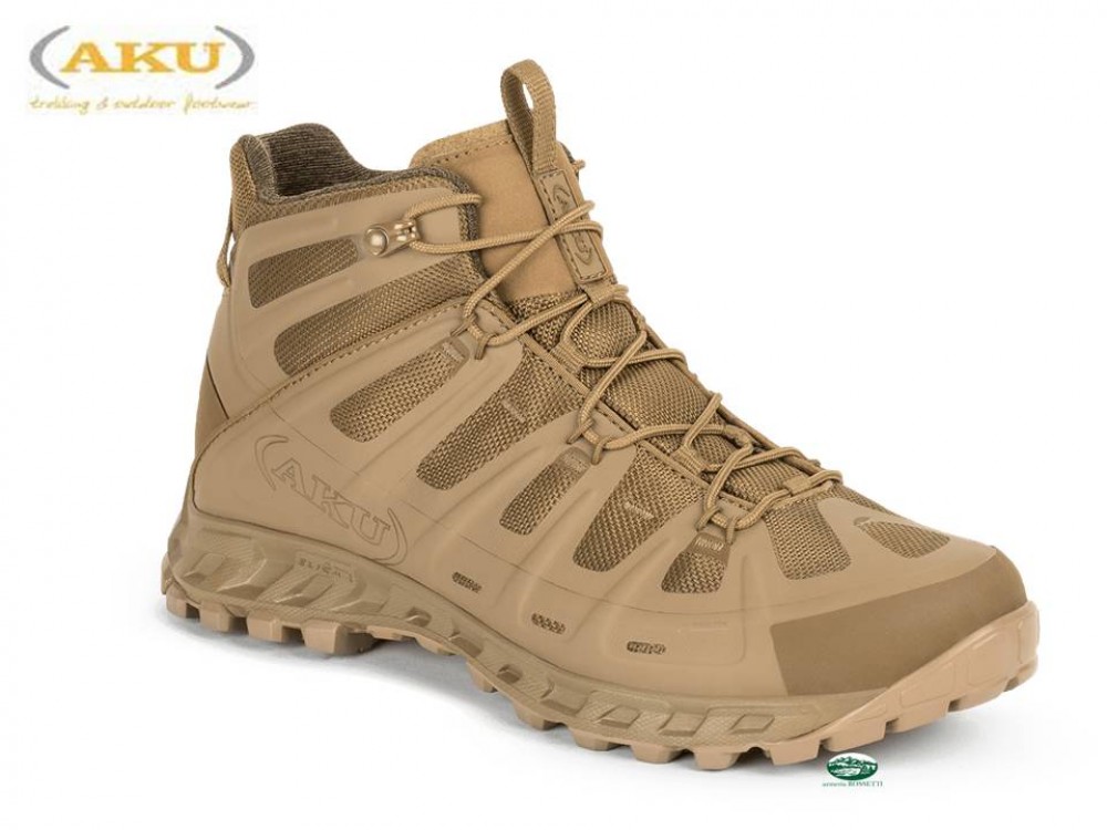 Calzatura progettata per le forze d’intervento rapido e attività tattiche, dinamiche e veloci, perfetta per utilizzi leggeri, per muoversi velocemente in totale comfort. Massima leggerezza, traspirabilità e supporto dinamico espresso da suola e tomaia, quest’ultima dotata di nervature sottomesse alla protezione in PU che elimina le cuciture. Il corpo sottopiede – suola – battistrada è sviluppato con tecnologia esclusiva AKU Elica Natural Stride System per favorire l’efficienza biodinamica. Il battistrada è Vibram® Selvatica Megagrip con una ottima superficie di contatto con il terreno per una migliore trazione a 360 gradi. Plantare OrthoLite® traspirante, con un ottimo assorbimento degli urti.