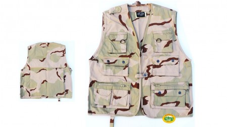 Gilet multitasche mimetismo desert in cotone leggero traspirante con fodera interna in rete. 9 tasche frontali con chiusura a zip e bottone carniera posteriore con chiusura a zip , 4 tasche interne pratiche ed utili per ogni situazione.