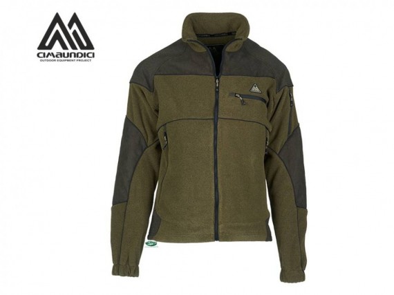 Cardigan da caccia CIMAUNDICI in caldo pile mélange da 300 grammi. Applicazioni a contrasto in suede e RK-TEX. Tre tasche frontali con zip e tasca sulla manica sinistra.