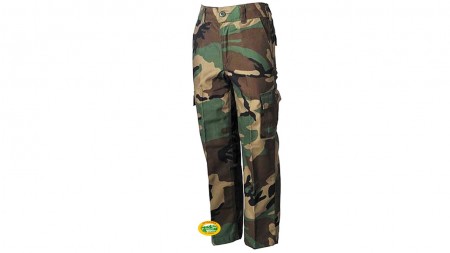 Pantaloni Militari Woodland per bambini con 2 tasche anteriori, 2 tasche posteriore, 2 tasche cargo, lacci alle caviglie, elastico in vita .