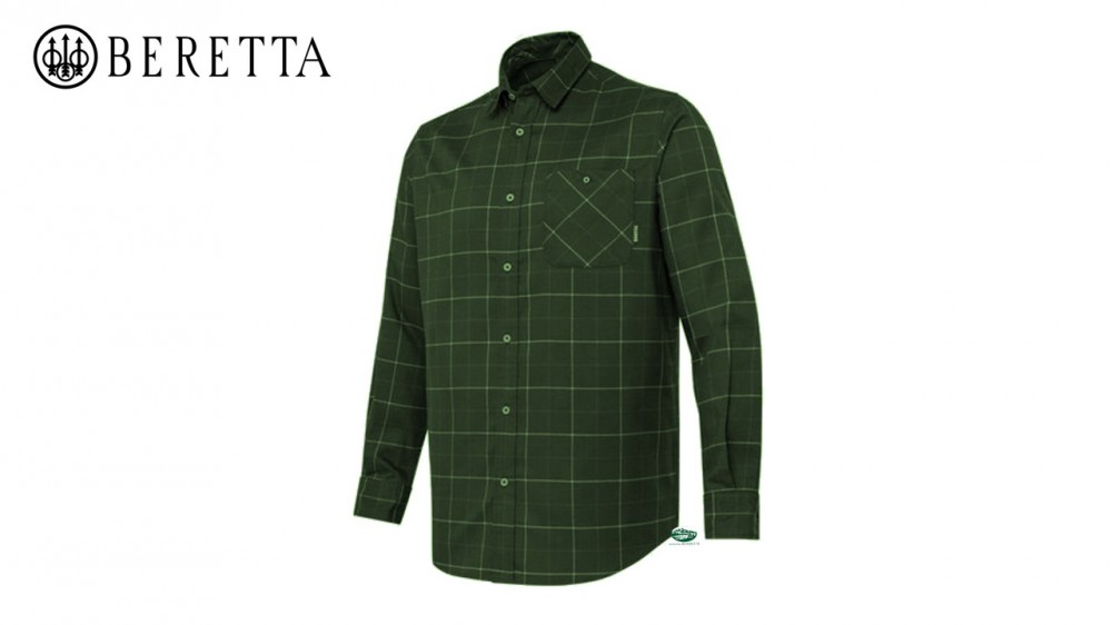 Camicia uomo Jargo stretch realizzata in misto poliestere riciclato ed elastan on tasca pettorale applicata.Colore verde con quadro arancio