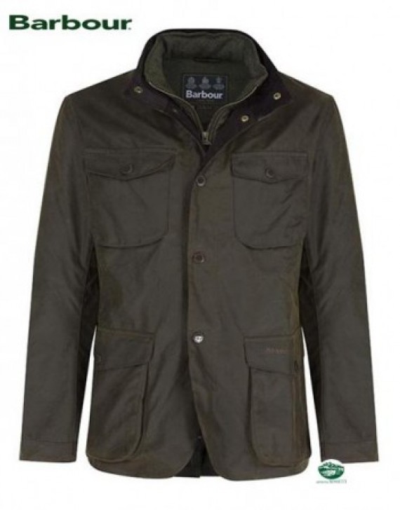 BARBOUR Giacca OGSTON cerata stondata sul fondo, giubbotto 4 tasche, con pettorina interna, toppe in pelle sui gomiti, bottoni sui fianchi per regolare l'ampiezza, foderata internamente in lana tartan, richiudibile con zip e bottoni a pressione logati, targhetta logo applicata dietro il collo, colore marrone/verde, vestibilità regolare.