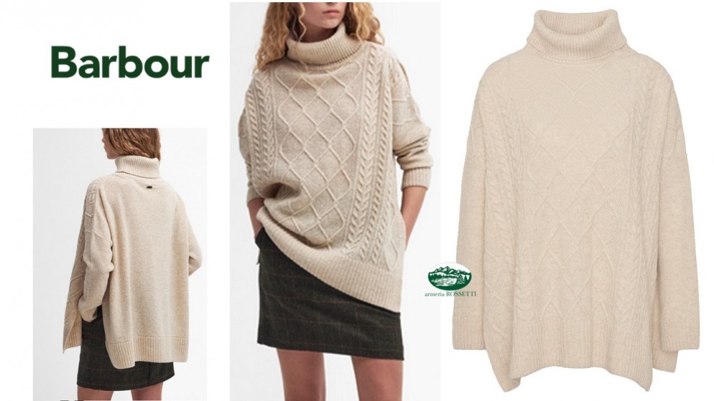 La mantella Barbour Burne è realizzata in un caldo tessuto di misto lana, con collo arrotolato e maniche lunghe. La maglia intrecciata di ispirazione argyle conferisce una nota elegante ai look casual.