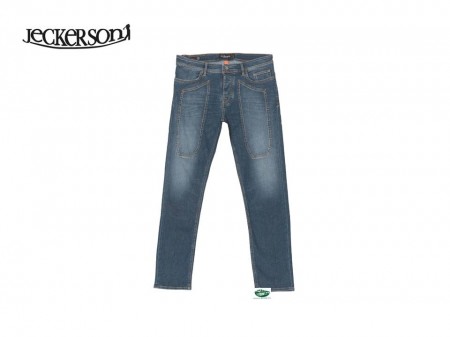 Jeans denim 5 tasche con toppa ,chiusura con zip e bottone,impunture colore giallo