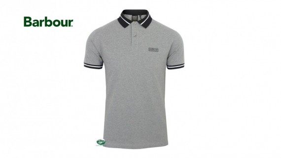 Polo uomo grigia in cotone 100% con colletto e bordo manica in contrasto blu e riga bianca, con logo Barbour stampato sul petto. Vestibilità regular