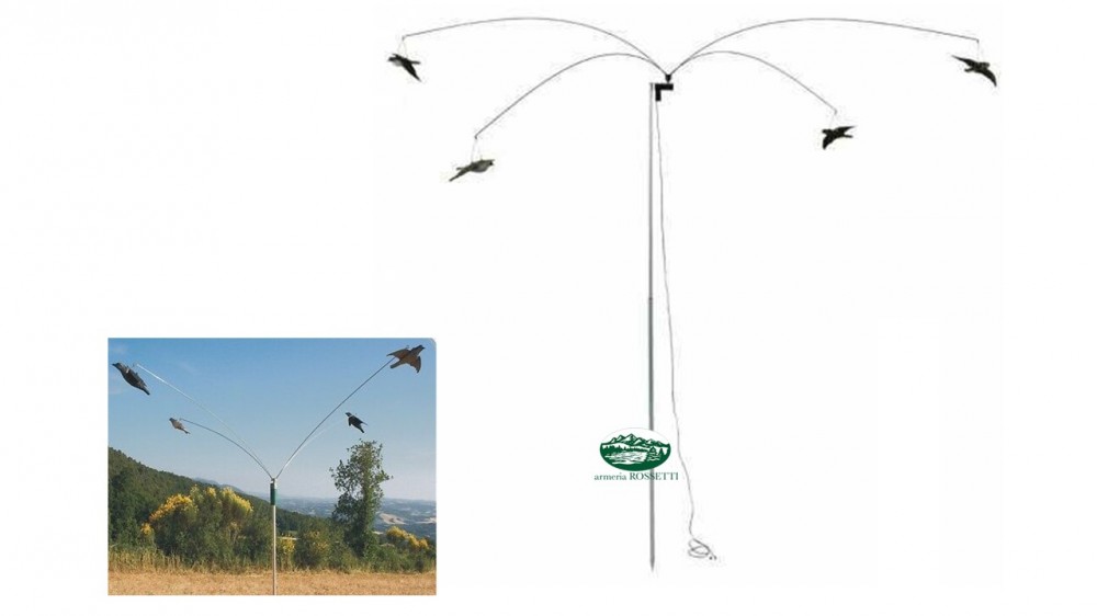 Giostra semplice per allodole o storni ,ottimo anche per 2 colombacci o 4 impagliati. Le braccia sono lunghe 120 cm.