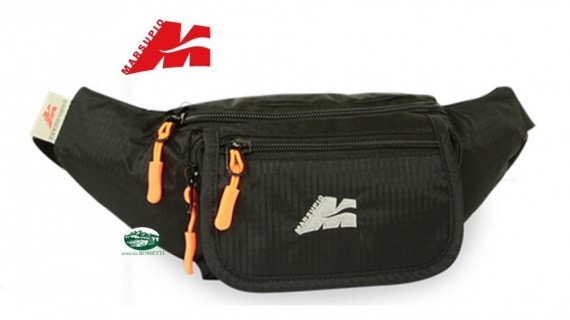 Marsupio dotato di numerosi scomparti, molto comodo e funzionale, con una tasca frontale, tasca posteriore porta documenti, cinghia a vita regolabile.