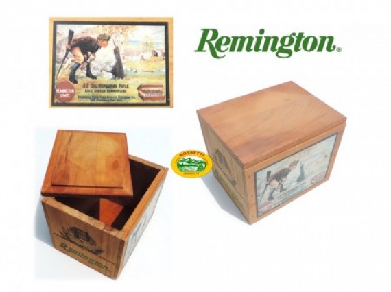 splendida cassettina in legno, riproduzione fedele di portamunizioni dei primi anni del '900 ha stampata sul frontale e sul retro una caratteristica immagine di un giovane cacciatore in azione e su i due lati esterni il marchio Remington - Peters