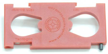 Inserimento: tenere il pollice dal lato opposto della finestra di ritenzione del blocchetto percussore (firing pin stop) leggendo sulla plastica l'incavo da utilizzare 1911/2011 - 1911 Bo-Mar - Tanfoglio, premere quindi il percussore dopo averlo alloggiato nell'apposito incavo sopra alla placca circolare metallica facendolo scorrere verso l'alto fino all'entrata del percussore nella sede ed al successivo bloccaggio del blocchetto percussore.
