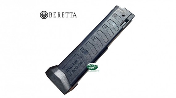 Caricatore originale per la pistola mitragliatrice Beretta PMX S e PMX, per proiettili calibro 9mm e capacità da 20 colpi, realizzato in tecnopolimero al alta resistenza di colore fume nero. Marchiato con la scritta 9mm, è compatibile con cartucce 9x21 e 9x19