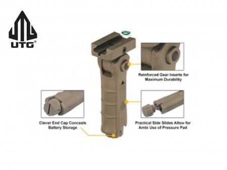 Impugnatura pieghevole,dotata di bottone di bloccaggio,per regolare le 5 posizioni,permettendo più stabilità,vano batterie con tappo di protezione,guide laterali ambidestre per consentire maggiore pressione