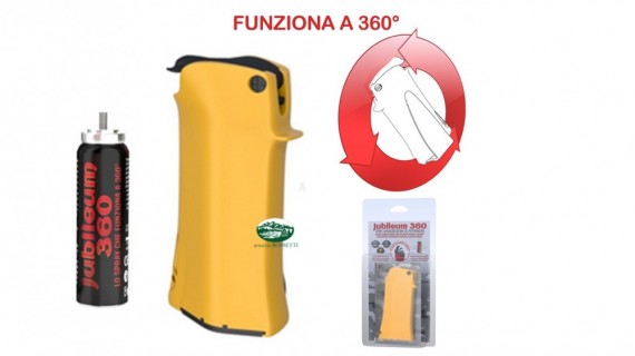 Gli spray al peperoncino Jubileum 360 sono i primi spray al mondo che funzionano a 360 gradi, ovvero in qualsiasi posizione vengono attivati, anche in posizione verticale opposta al normale utilizzo. Sono l’evoluzione dei TW1000 Man e tra i più sicuri, potenti ed efficaci sul mercato, con caratteristiche molto simili alla gamma TW1000: altissimo grado di piccantezza Scoville 2.000.000, getto più preciso e direzionale fino a 3 metri di distanza, quantità elevata di 20 ml di prodotto. Sono completi di manicotto rigido che aiutano a prendere la mira e a colpire l’aggressore con sicurezza. Ideale per chi si trova in casa o in negozio.