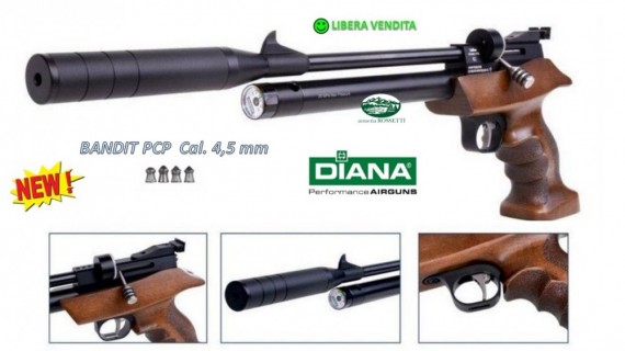 La Diana Bandit è la prima pistola ad aria pre-compressa (PCP) della nota azienda tedesca; esteticamente allettante grazie all'impugnatura in legno sagomata e zigrinata che miscela sapientemente sapori di Look moderno e classico allo stesso tempo. La Bandit ha un serbatoio d'aria da 200 Bar, un caricatore estraibile da 9 colpi in calibro 4,5mm con potenza di 7,5 joule.