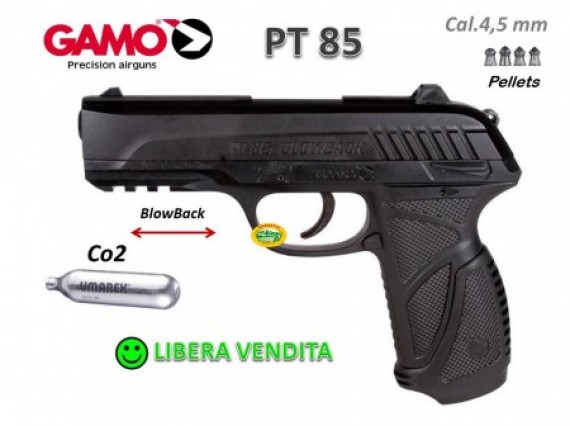 La popolare casa spagnola Gamo presenta questa sorprendente e innovativa pistola con effetto Blow-Back. La PT-85 è una pistola solida e comoda che include il Rail Picatinny sotto la canna. Con il carrello metallico e l impugnatura in polimero incorpora la novità di un caricatore ribaltabile da 8 colpi in ogni lato per un totale di 16 colpi