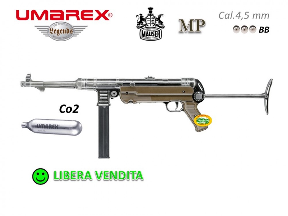 Umarex pistola Legends MP German, CO2, Blowback, <7,5 joule, calibro 4,5, dotata di calcio pieghevole e metal receiver.