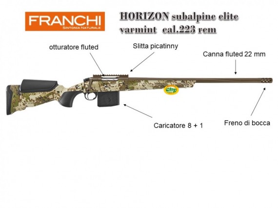 Dai varminter puri l'allestimento in cal.223 REM, che permette di utilizzare al meglio proiettili anche un po’ più lunghi, dai classici 55 grani fino a munizioni più pesanti c. Con profilo fluted e canne scanalate, che ne arretrano il baricentro, la Horizon Varmint presenta un'ottimo bilanciamento dei pesi, rendendola stabile e maneggevole allo stesso tempo e donandole uno stile moderno. L'otturatore nichelato Dependa Bolt è fluted, con un sistema a tre alette di chiusura, e consente un'apertura a 60°. La manetta conica alleggerita è facilmente smontabile per la manutenzione ordinaria. Questa Bolt Action ha basetta, freno di bocca e nasello medio montati, con nasello basso e alto opzionale per regolare l'altezza della messa in mira. Dalle linee aggressive e di carattere, tra le carabine da caccia è la scelta perfetta per vivere intense emozioni venatorie. Lo scatto Relia Trigger è pulito e nitido, con un peso regolabile da 0,8 a 1,9 Kg, e contribuisce ad aumentarne la precisione balistica, che come per tutte le Horizon è testata per garantire 1 M.O.A. su tre colpi sparati.