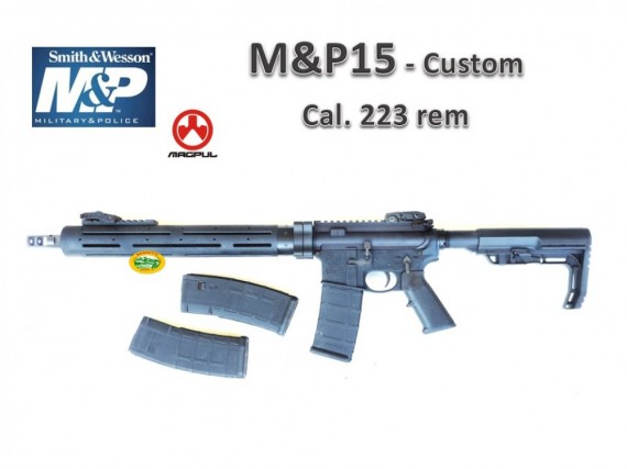 l'M&P 15 è una realizzazione con qualità Smith & Wesson della piattaforma AR con canna da 16". Questo esemplare customizzato dalla Bignami presenta di serie un guardamano free float in alluminio a profilo cilindrico, con slitte Picatinny, calcio comfort SWT, mire Magpul e tre caricatori di serie. Sparato pochi colpi. Arma sportiva.