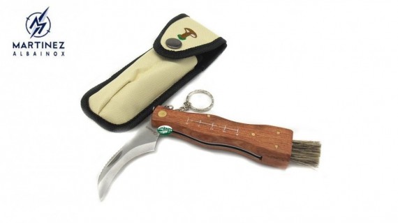 Coltello sportivo. Manico in legno con misurometro stampato sul manico. Catenella con anello. Spazzolino in setola. Dotato di pinzetta e di fodero con passante per cinture alte 6 cm. Lunghezza da chiuso 13,5 cm.