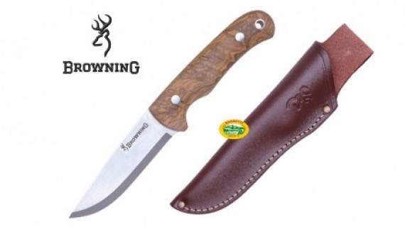 Coltello a lama fissa con manico ergonomico in legno di olivo e fodero in pelle incluso.