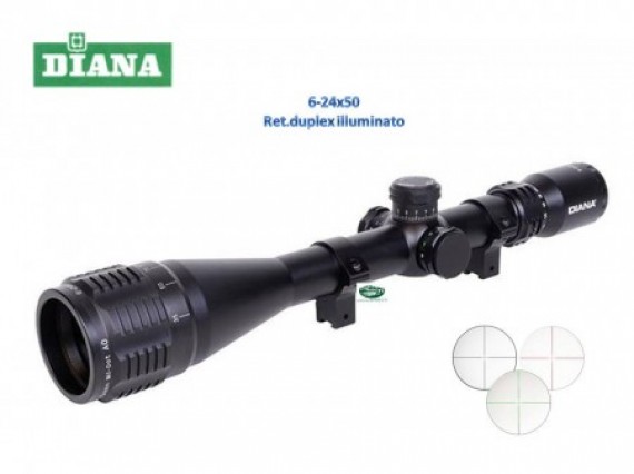 Ottica Diana che fornisce da 6 a 24 ingrandimenti e con lente da50 . Regolazione a 1/4" di MOA, reticolo Duplex illuminato rosso e verde (5 intensita per colore) resistente agli urti, tubo da 30mm, correttore di parallasse, torrette regolabili a mano, impermeabile con gas nitrogeno, resistente all’umidità. Ottica con lenti multitrattata. Messa a fuoco a partire da 10 yds. Corredata di coprilenti in plastica e attacchi 2 pezzi per scina da 11mm.