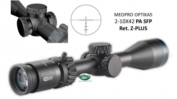 Optika5 2-10x42 ha il tubo da 1" fucili presentano rivestimenti per lenti MeoBright per una trasmissione ottimale della luce e rivestimento idrorepellente idrofobo MeoDrop. I cannocchiali 2-10x42 Le opzioni del reticolo del secondo piano focale includono Z-Plex e Z-Plus basato su MOA. Le regolazioni di ¼ MOA sono standard su entrambi i modelli. Con correttore di parallasse.