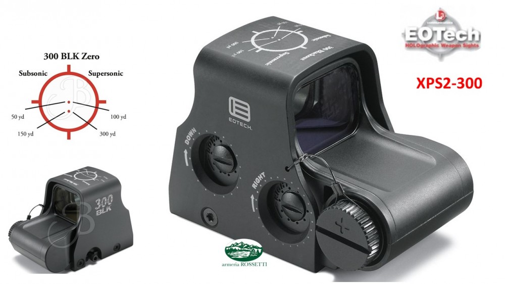 XPS2 Holographic Weapon Sight di EOTECH è un mirino ottico leggero, 1X, progettato per un utilizzo a corto e medio raggio. Fornisce l'acquisizione del bersaglio molto rapidamente a corto raggio, fornendo al contempo una capacità di puntamento fino a 300 metriro. XPS2 presenta pulsanti laterali di facile regolazione e una batteria al litio CR123A montata trasversalmente. La durata delle batterie è di 600 ore, la regolazione dell'alzo e deriva di 1/2 MOA. La luminosità è gestita tramite due pulsanti frontali con 12 regolazioni di intensità. Il reticolo è studiato espressamente per il calibro .300 Blackout, questo fa si che EXPS3 sia uno dei sistemi più rapidi di acquisizione del bersaglio presenti sul mercato.