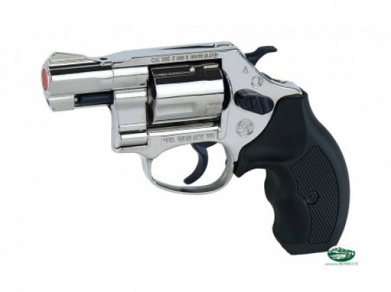 Revolver a cinque colpi in calibro 380 a salve nickelato con funzionamento a singola e doppia azione. Libera vendita a maggiorenni.
