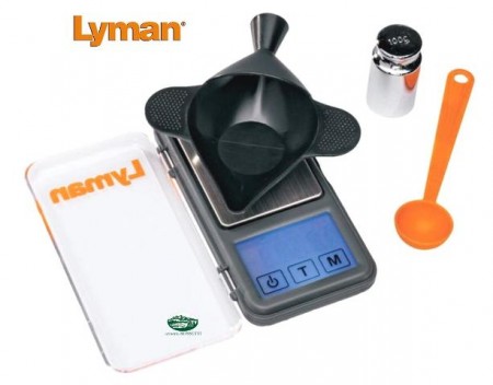 Bilancia digitale Lyman completa di batterie , misurino, piattino-imbutino. Ha una capacità di pesata fino a 1500 grani.