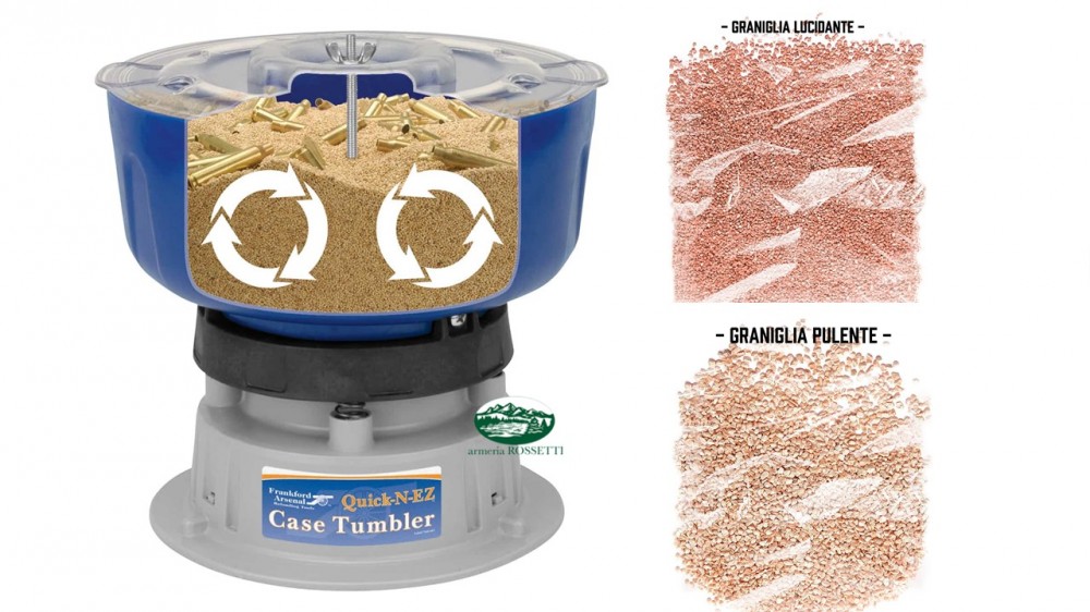 Il Vibro-Pulitore per bossoli e piccoli oggetti metallici Quick-n-EZ ti permette di pulire in maniera rapida, facile ed economica i tuoi bossoli o qualsiasi altro oggetto metallic o che tu desideri rendere pulito e brillante! Utilizzato con la graniglia Frankford Arsenal il Vibro-Pulitore Quick-n-EZ rimuove i residui di sporcizia, di lubrificanti e di ruggine dai metalli. Il Vibro-Pulitore Quick-n-EZ può contenere fino a 600 bossoli 9mm e 350 bossoli .223