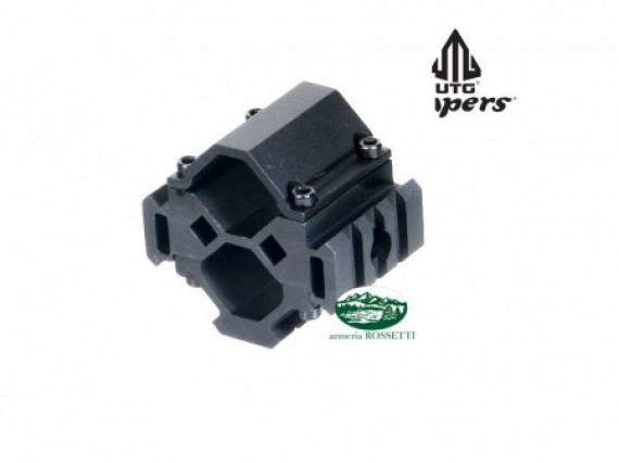 Attacco in lega d'alluminio a 3 vie universale per tocia, laser e bipiede. Compatibile con tutte le canne con diametro da 75'' a 1,1'' - Predisposta per tutti i bipiedi con attacco weaver - 3 slitte weaver in dotazione da 40,64 cm ciascuna, 2 laterali e 1 inferiore (3 slot ciascuna). Possibilità di montare qualsiasi accessorio aggiuntivo.