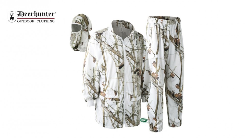 Completo giacca ,pantalone e maschera facciale,in mimetismo Snow.La giacca ha 2 tasche frontali e tasche aperte che permettono di accedere alle tasche dell'equipaggiamento sottostante.Carniera con chiusura bottoni automatici.Coulisse in vita e sul fondo.Il pantalone ha sempre due tasche aperte,che permettono di accedere alle tasche dell'equipaggiamento sottostante.Coulisse in vita ed elastico sul fondo.La maschera facciale ha fori sulla bocca,per una facile respirazione.