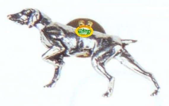 Spilla peltro cane caccia.