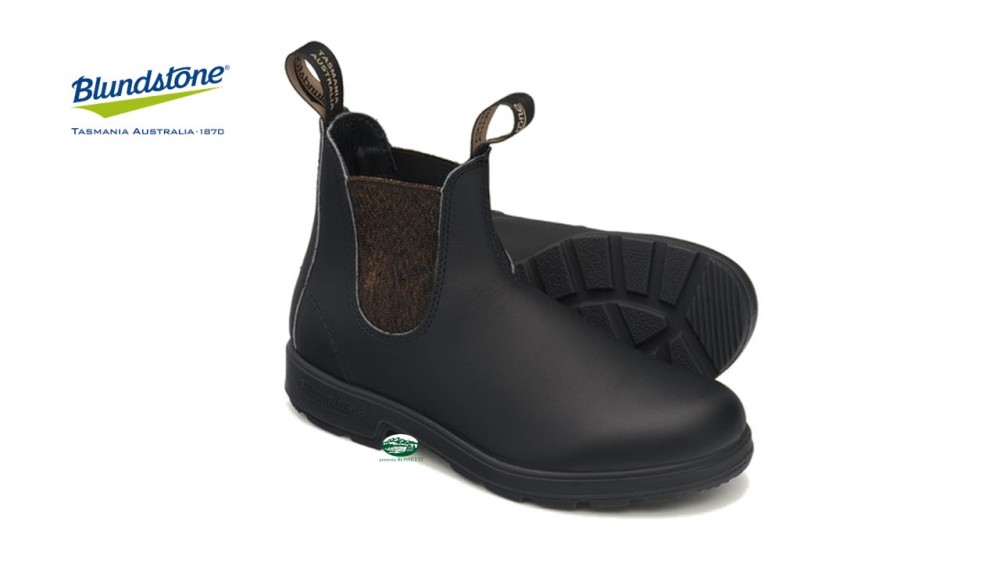 Boot donna modello Blundstone 1924 in stile Chelsea, realizzati in pelle nera impermeabile con elastici laterali glitter bronzo.
