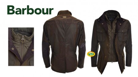 BARBOUR Giacca OGSTON cerata stondata sul fondo, giubbotto 4 tasche, con pettorina interna, toppe in pelle sui gomiti, bottoni sui fianchi per regolare l'ampiezza, foderata internamente in lana tartan, richiudibile con zip e bottoni a pressione logati, targhetta logo applicata dietro il collo, colore marrone/verde, vestibilità regolare.
