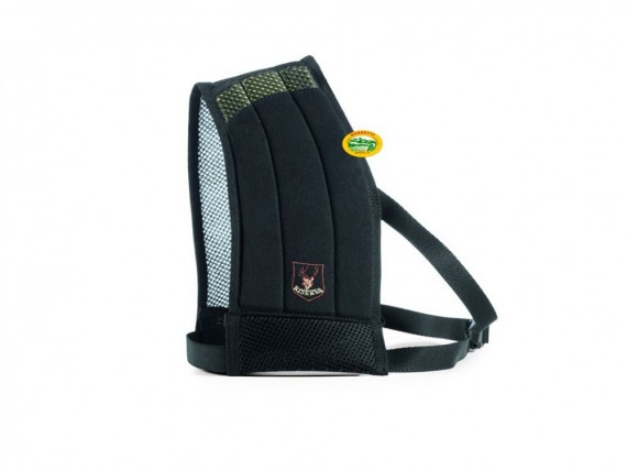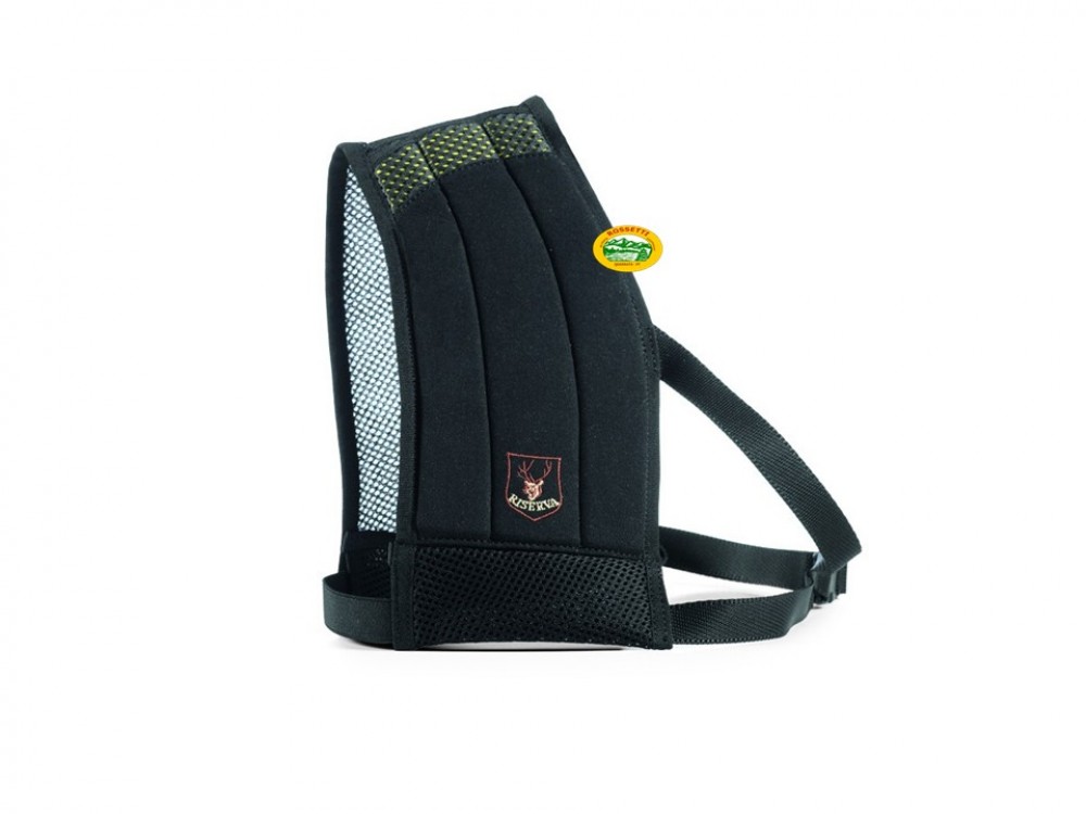 Spallina antishock regolabile, realizzata in rete con inserto in alcantara e interno in Poron che protegge la spalla assorbendo il rinculo dell'arma.