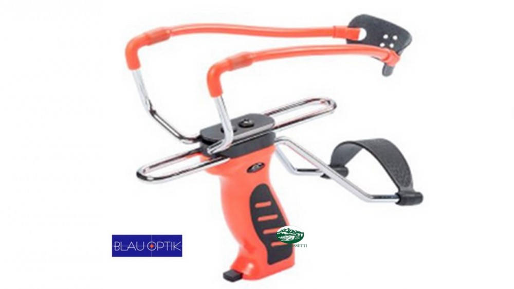 Fionda FT con appoggiabraccio regolabile IF14 . Nell’impugnatura si possono riporre le sfere che vengono rilasciate premendo un pulsante; il parabraccio e la forcella sono regolabili autonomamante.