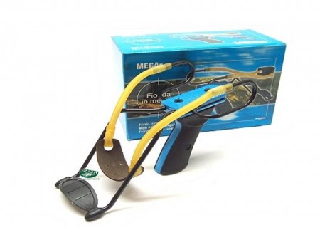 Fionda in polimero con appoggia braccio,elastico in lattice di gomma con porta sfere in cuoio antiscivolo.Lunghezza elastico 42 cm.Dotata di appoggia braccio in metallo cromato e plastica fissa lungo 18 cm,largo7,5 cm.