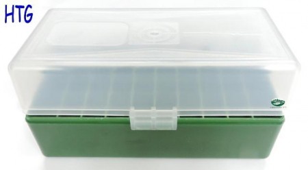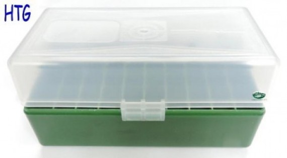 Scatolina porta 50 colpi per calibro 243 - 300 Sa - 308 - 338 - 6,5x50 - 7mm-08 - 7,65x53. Il colore può variare in base alla disponibilità del fornitore.