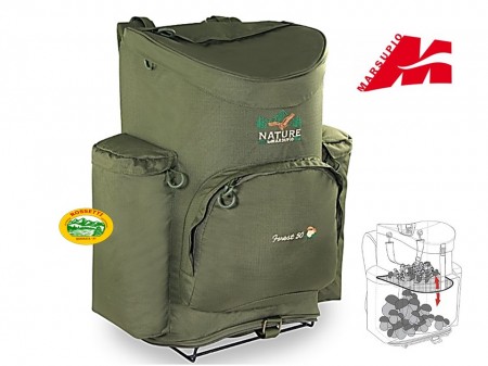 Zaino tecnico per la raccolta funghi con bastino imbottito e cinghia a vita. Utilizzabile anche come zaino da montagna togliendo il rivestimento rigido all’interno. È a norma di legge, munito di cesto retinato che all’occorrenza si può levare e sul fondo ha una patta estraibile di chiusura. All’interno vi è un comodo divisorio in rete che è posizionato a metà zaino e si può alzare o abbassare in base alla necessità, è completamente removibile e serve ad alleggerire il peso dei funghi come a differenziarne le diverse qualità, posizionando i pesanti sotto e quelli più leggeri sopra preservandone la freschezza. Internamente è fissata una comoda tracolla regolabile e una maniglia per il trasporto. Dotato di tasca frontale porta oggetti e tesserino, tasconi laterali e tasca sul cappuccio con stampa interna SOS. La struttura di sostegno in metallo si inserisce facilmente seguendo il disegno riportato sopra