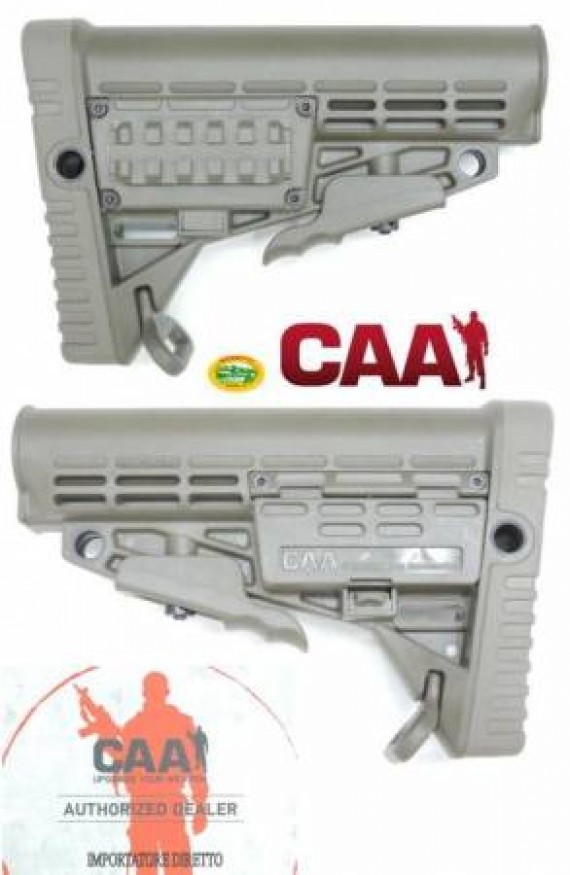 CAA Tactical calcio collassabile per M4 con poggiaspalla in gomma slitta picatinny laterale e vano portabatterie (4 CR123) specifico per tubi CIVILI.
