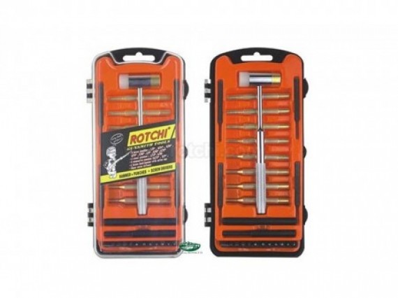 Kit cacciaspine di Gun Smith Martello con tappi in ottone e plastica, esadecimale. foro per il bit del cacciavite 8 punzoni in ottone: 1/8 ", 9/64", 5/32 ", 3/16", 7/32 ", 1/4", 9/32 ", 5/16" 4 punzoni in acciaio: 1/16 "x2, 3/32" x2 2 punzoni di plastica: 15/64 ", 3/8" 12 punte per cacciavite