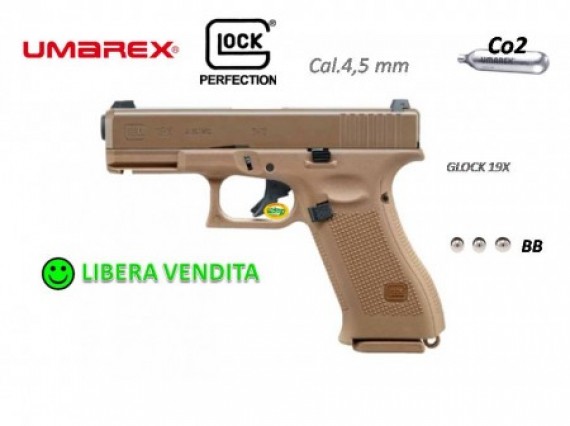 GLOCK descrive la G19X come la sua prima "pistola crossover". Combina il telaio full-size del G17 con il carrello compatto del G19. Il colore speciale, il Coyote, distingue questa pistola dagli altri modelli. Umarex ha fatto la copia in CO2, una replica autentica con le dimensioni e le marcature esatte dell'originale. Spara BB in acciaio da 4,5 mm con un massimo di 2 joule.