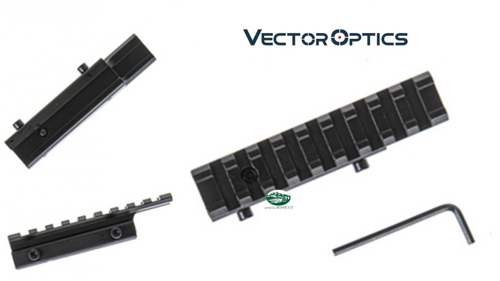 attacco in alluminio areonautico, converte l'attacco da scina 11 a picatinny. La slitta con 9 slot è lunga in totale 100 mm.