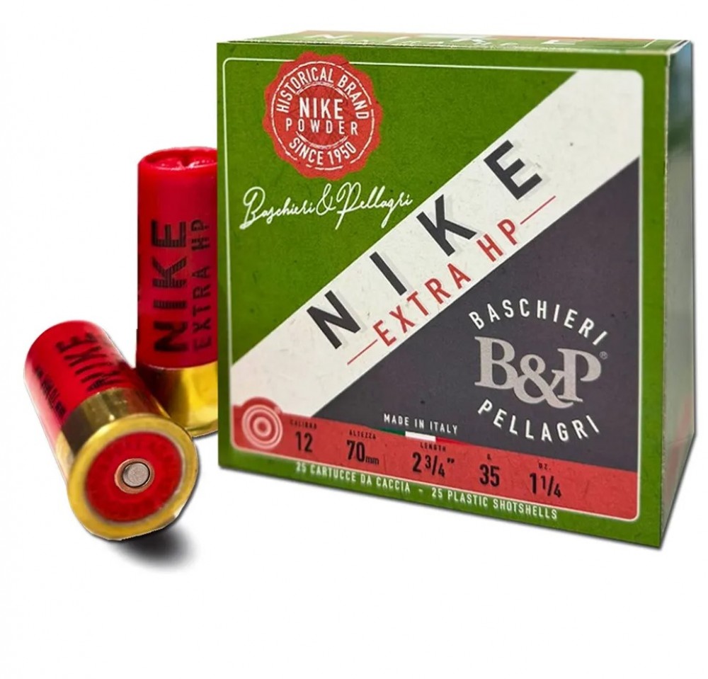 La nuova NIKE HP è caricata in bossolo Gordon di plastica rossa, con 35 grammi di piombo temperato, borra in plastica con contenitore tipo Z2M e un propellente tutto nuovo, mutuato dalla vecchia gloriosa polvere Nike, a cui è stato dato un carattere combustivo più lento e quindi una maggiore progressività di spinta.