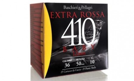 Cartuccia in calibro 410 studiata per fucili con camera ridotta da 50 mm in poi, ideale per tiri corti al capanno per ridurre danni alla Caricata con borra contenitore Baby 410 , disegno esclusivo Baschieri & Pellagri, e chiusura ad orlo tondo.