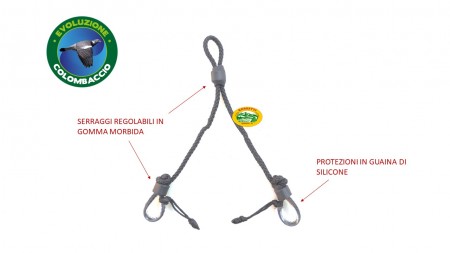 coppia di calzette, realizzata in cordino di Nylon con occhielli a chiusura controllata tramite nodino, facilmente regolabile. I due anelli sono rivestiti in morbido silicone per non irritare le zampette del piccione, anche dopo un utilizzo prolungato.